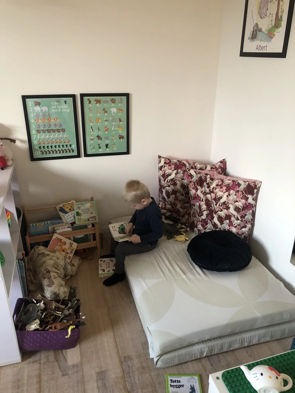 Jeg tager imod børnene i mit bryggers. Her har barnet sin egen plads med eget mærke til overtøj, og en kasse til skiftetøj. Vores samlingspunkt er i husets køkken/alrum samt nyindrettet legeværelse, hvor der er god plads til at tumle rundt. Jeg har en stor have med sandkasse, gyngestativ, cykler, legehus og frugttræer, hvor vi også får masser af tid til at gå.