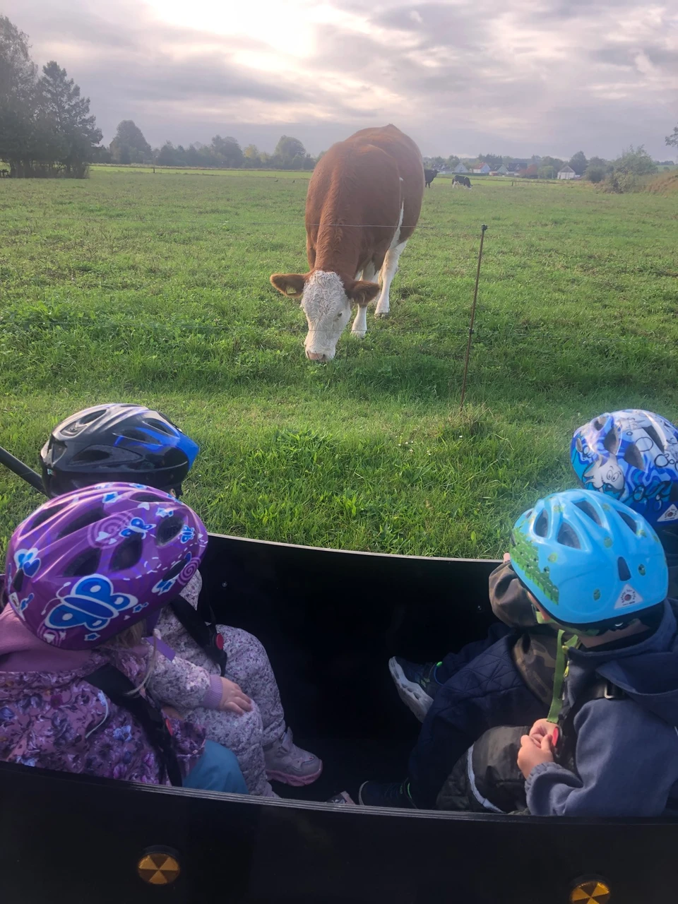 Jeg bor lige op til grønne områder som vi benytter os af, enten alene eller sammen med mine kollegaer. Jeg har en cykel hvor alle børnene kan være i, så når vejret er til det, tager vi gerne på tur og ser på dyr eller tog og får os en hyggelig snak om det vi oplever på vejen.