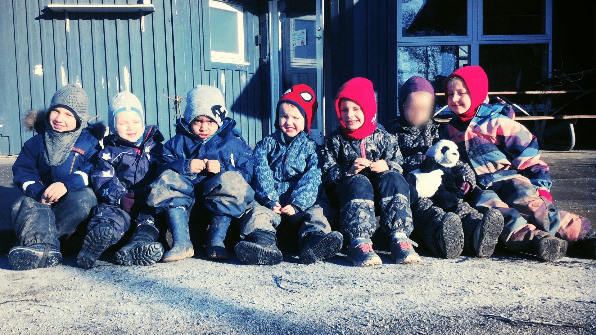 "7 børn med huer på stribe sad